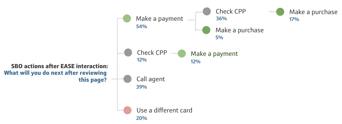After interacting with the post-decline flows, more small business owners said they would first make a payment to lower their balance. Whether a payment would be made immediately depends on situations such as small business owners having sufficient funds available or some small business owners prefer to pay at the end of their billing cycle.