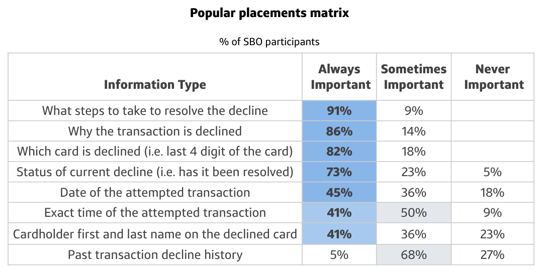 Customers don’t want to be stuck in a decline state that would impact future purchasing. They find it always important to know what steps to take to resolve the decline, why the transaction is declined, which card is declined, who was declined, when the decline occurred, and the status of the current decline.